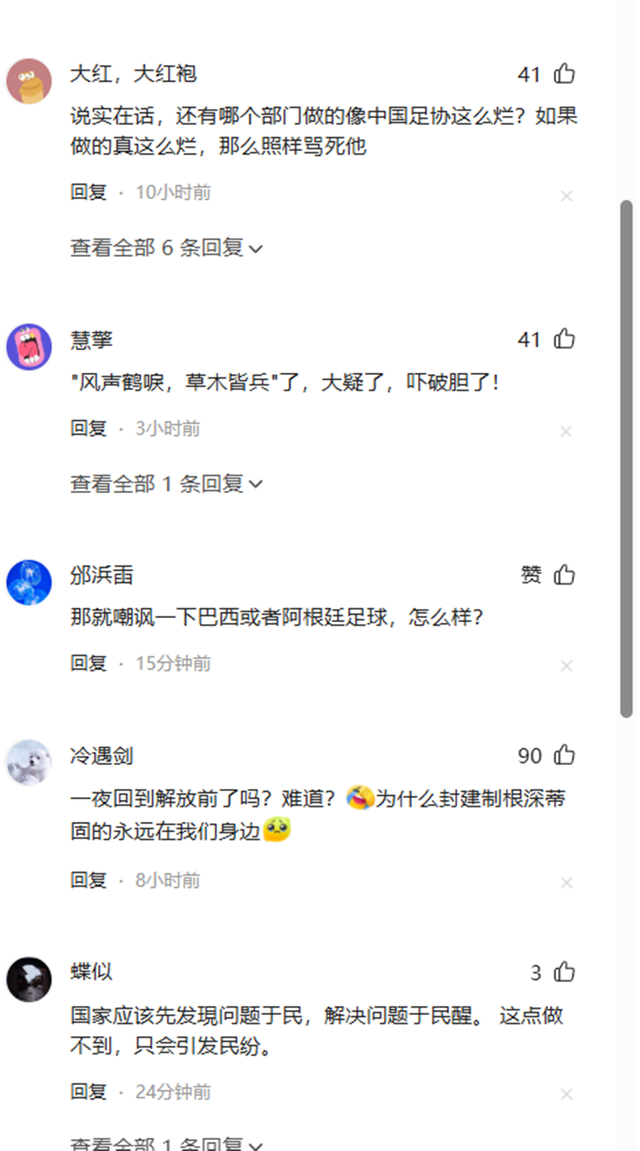 不得不承认一件事,那就是社会舆论环境是随着时代开始变化的。曾几何时,中国足球还是相当不错的。如果我们仔细回想一下。范志毅,那个年代最起码敢打敢拼,现在的一些足球运动员拿不了好成绩,还耗费了很多钱。难道网友们讲几句话就不行?这背后透出来的问题绝对不单单是足球的问题。如果在社会当中批评不自由,那么赞美也就没有任何的意义,大家只是一味的歌颂,好像就太平了,这种想法...