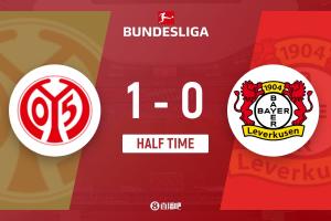 赛事直播互动-半场-勒沃库森0-1美因茨 内布尔破门格里马尔多伤退药厂0射正