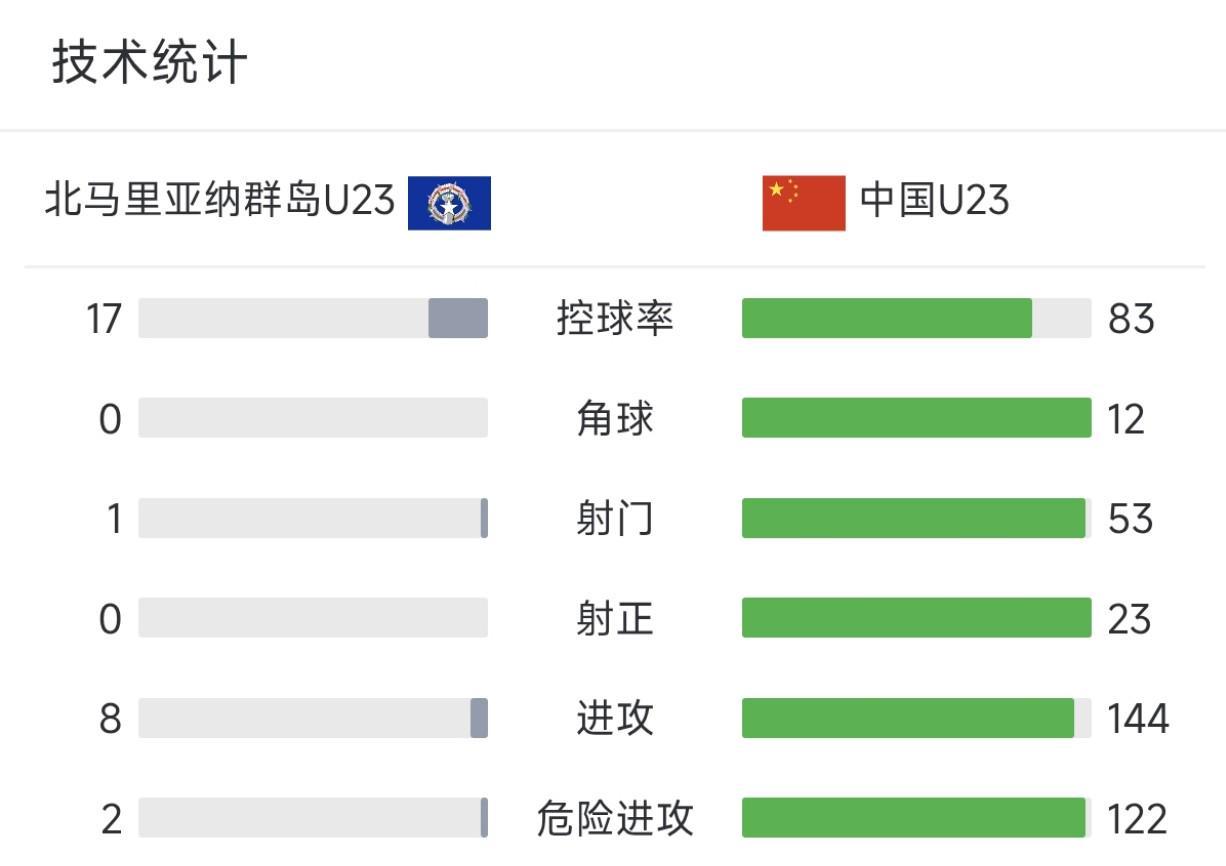 9月6日晚上,中国U22男足以10-0的比分击败了北马里亚纳群岛U22男足,全场比赛,中国队在数据上占据着绝对的优势。本场比赛,U22男足方面控球率达到了83%,获得了144次进攻机会,其中122次发起了危险进攻。射门数方面,中国队53次射门,其中23次射正,对方只有1次没有射正的射门。此外,中国队还获得了12个角球,对方则是没有角球。...